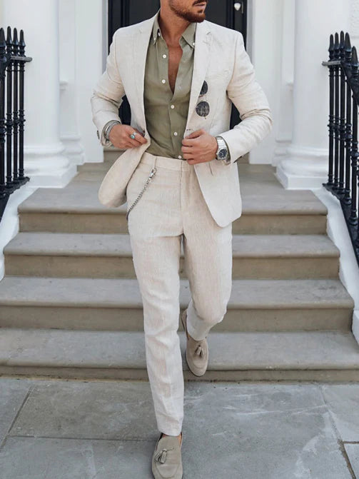 Ce costume deux pièces sur mesure pour homme, idéal pour un invité à un mariage, allie un style contemporain à une coupe personnalisée. Composé d'une veste et d'un pantalon assortis, il offre une silhouette épurée et raffinée, parfaite pour les cérémonies et les réceptions.