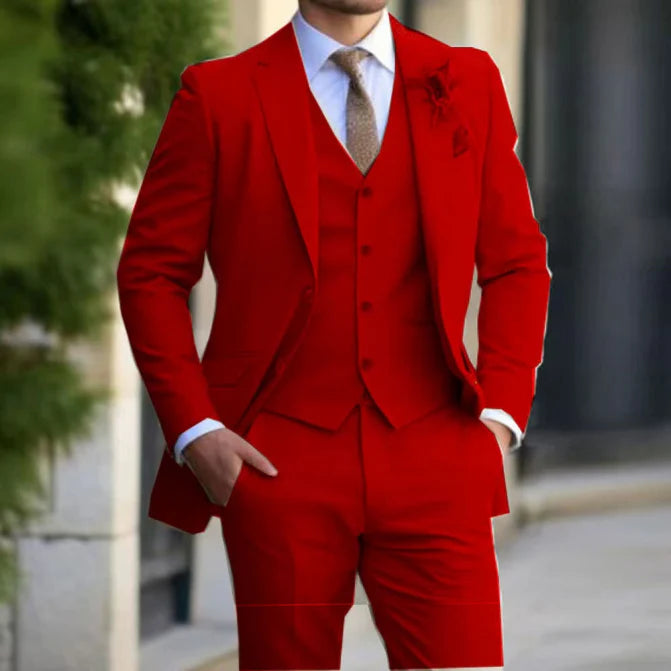 Ce costume trois pièces pour homme, pensé pour un invité de mariage, mise sur une coupe intemporelle adaptée aux grandes occasions. Composé d’une veste, d’un gilet et d’un pantalon assortis, il offre une allure soignée et harmonieuse qui traverse les tendances.