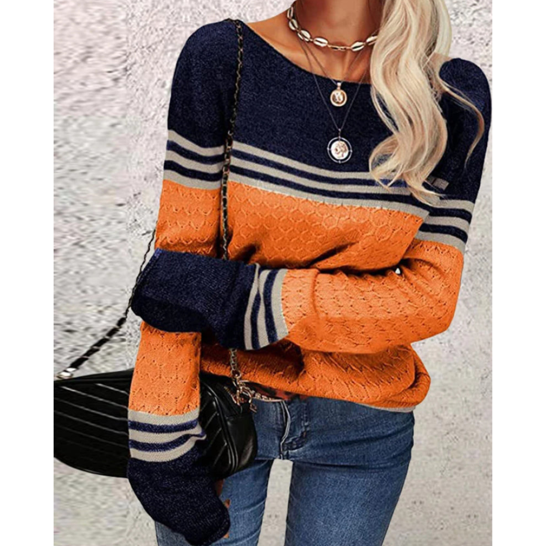 Get ready for the cold seasons with Arabelle, a versatile sweater that combines warmth and sophistication. With its modern stripes and color blocks, this crew neck long-sleeve sweater is perfect to enhance your autumn and winter outfits.