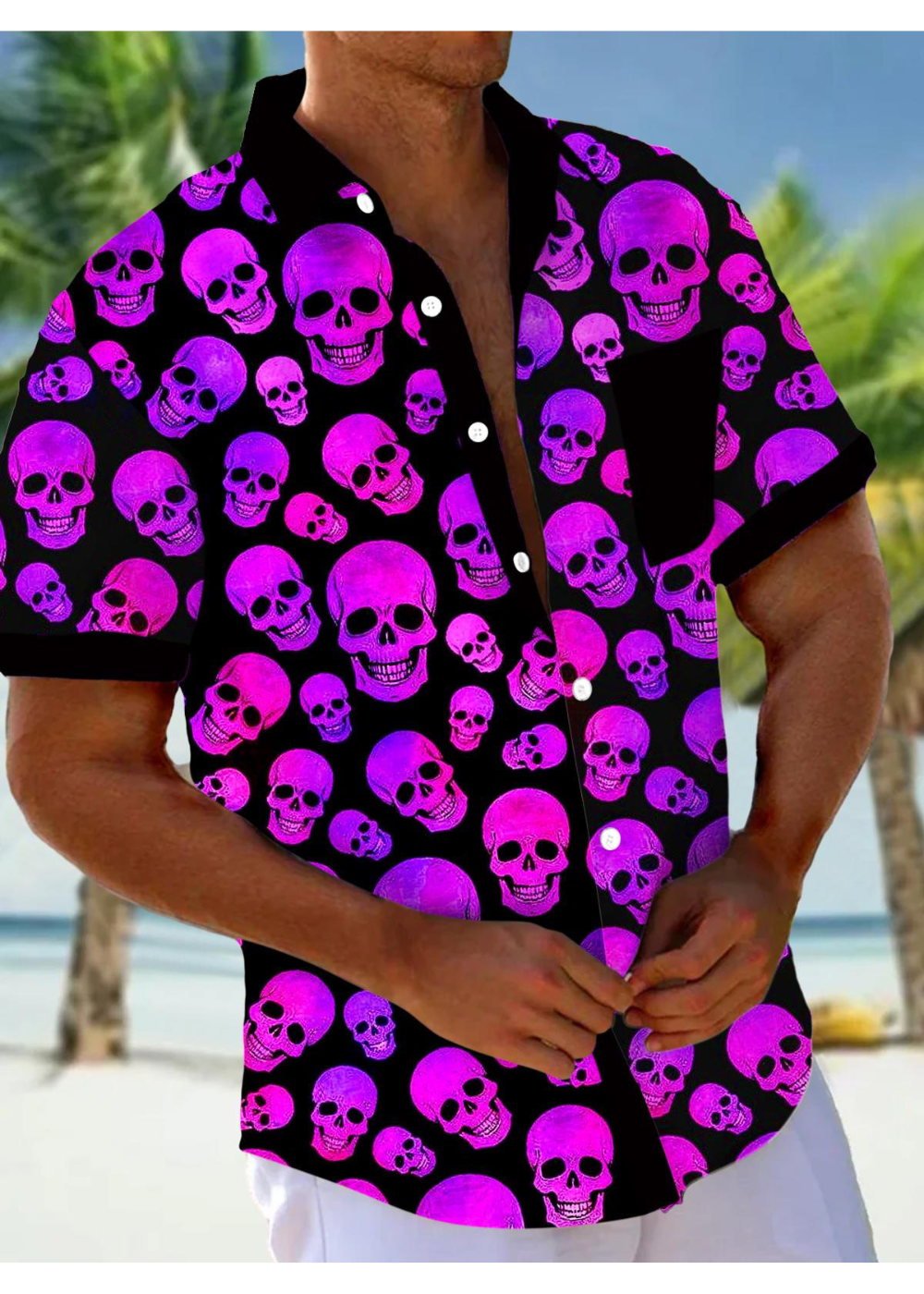 Découvrez la chemise Roman, un modèle pour homme à la fois cool et percutant, doté de manches courtes et d’un imprimé tête de mort.